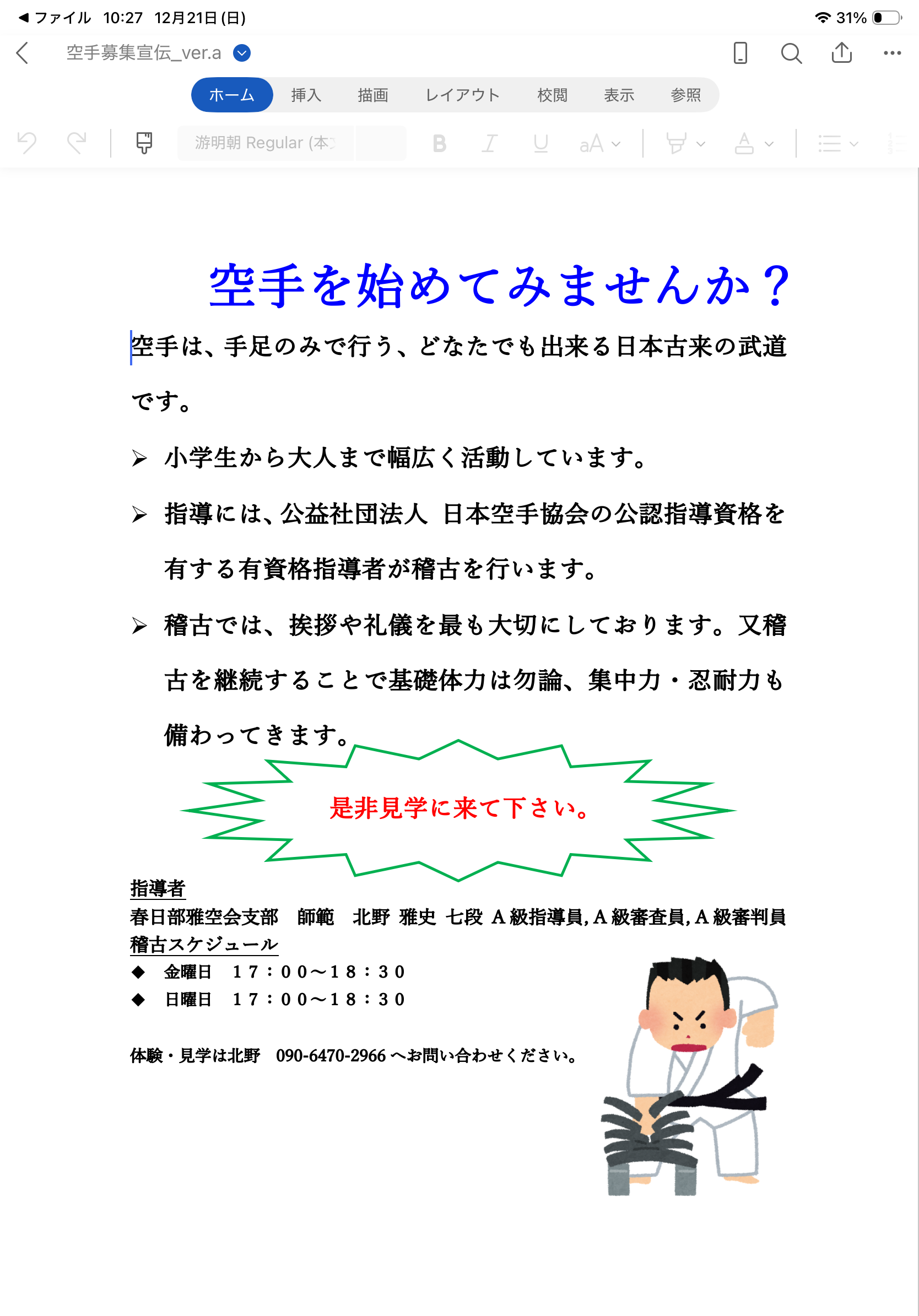 ・指導には、公益社団法人 日本空手協会の有資格指導者が丁
